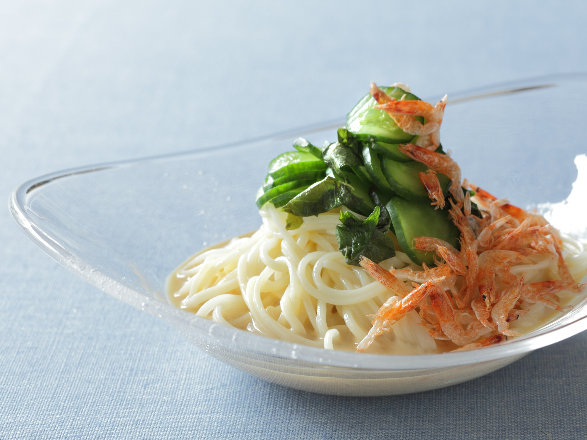 桜海老ときゅうりの冷や麦 豆乳味噌スープ