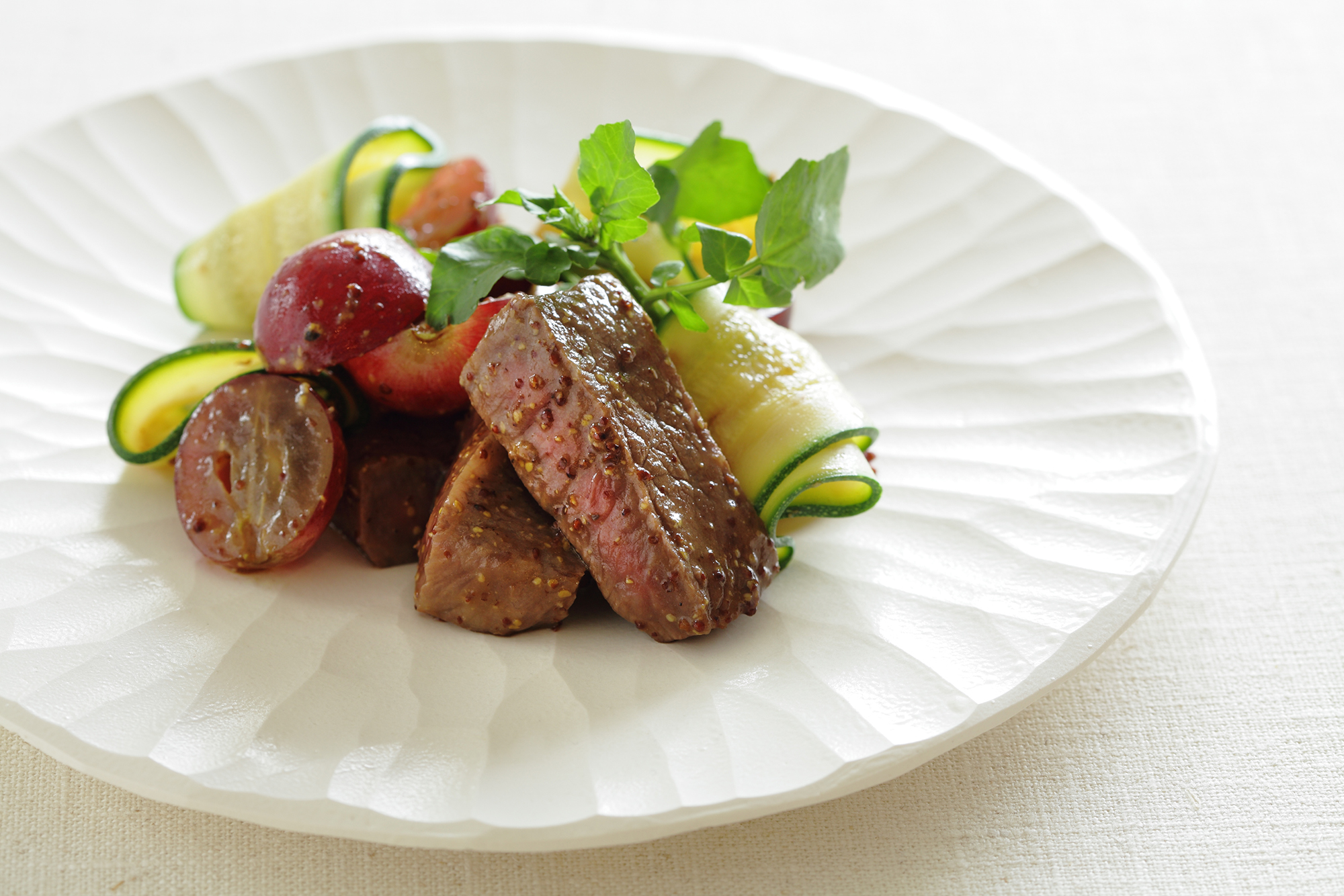 牛ステーキとぶどう、ズッキーニのサラダ仕立て